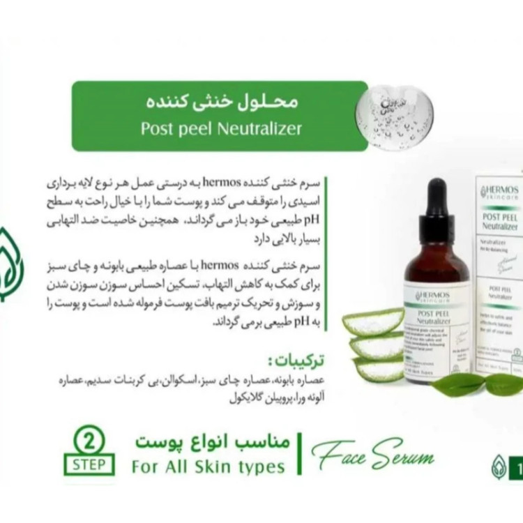 سرم خنثی کننده هرموس 50 میلی لیتر یکی از سرم های فوق العاده با کارایی خنثی کنندگی هر عمل اسید تراپی می باشد. و لایه برداری اسید تراپی را متوقف می کند. این سرم با ترکیبات چای سبز و بابونه کاهش التهاب و تسکین درجای سوزش می شود. و پوست را به حالت ph طبیعی بر می گرداند.
