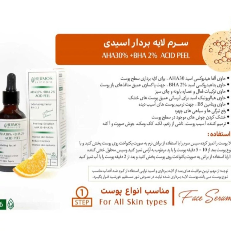 این سرم لایه بردار بسیار قوی که دارای هیدروکسی اسید 30% برای لایه برداری سطح پوست. و بتاهیدروکسی اسید2%جهت پاکسازی منافذ باز عمیق پوست می باشد. ویژگی ها: حاوی آلفا هیدروکسی اسید 30%، برای لایه برداری سطح پوست حاوی بتا هیدروکسی اسید 2% ،جهت پاکسازی عمیق منافذهای باز پوست حاوی ترکیبات فعال و عصاره بابونه و چای سبز حاوی هیالورونیک اسید برای آبرسانی عمیق پوستهای خشک حاوی ویتامین B5 ، جهت ترمیم پوست های آسیب دیده رفع تیرگی ها و سیاهی های چهره خشک کردن جوشهای موجود در سطح پوست ترمیم کننده آسیب پوست ناشی از زخم ،لک کک و مک، جوش صورت و آکنه