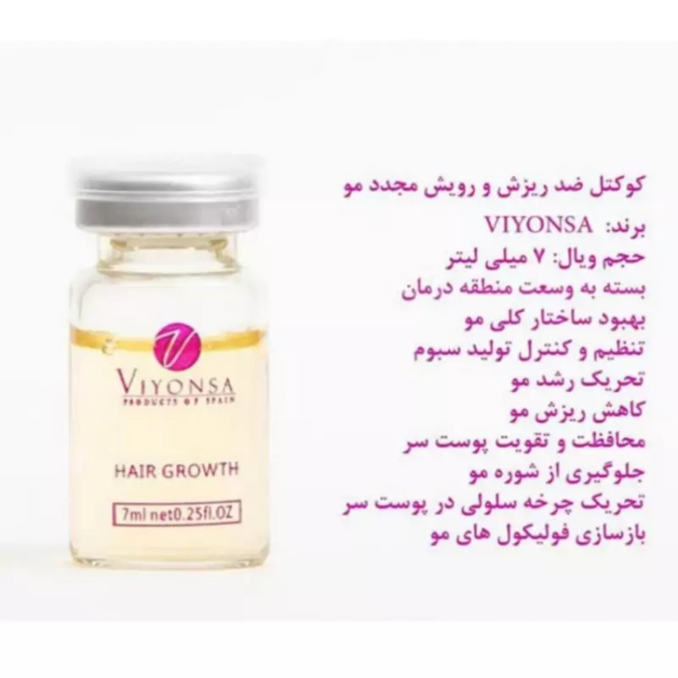 ✅کوکتل ضد ریزش و رشد مجدد مو ویونسا اسپانیا با حجم 7 میلی لیتر مناسب برای آبرسانی به کف سر، کمک به قطع ریزش و رشد مجدد مو آقایان و بانوان می باشد. مو نقش بسیار زیادی در زیبایی چهره دارد و مراقبت از آن بسیار مهم و ضروری است. ریزش مو دلایل بسیار زیادی میتواند داشته باشد و در کنار آن راه حل های مختلفی برای درمان آن هست. از جمله آنها استفاده از دارو ها و مکمل های تقویتی و استفاده از ویتامین های مختلف، استفاده از مکمل های گیاهی و خانگی استفاده از روغن های گیاهی، کاشت مو و مزوتراپی است. اما بسیاری از زیباجویان عزیز دنبال راه حلی هستند که در زمان کمتری به نتیجه برسند و هم از لحاظ هزینه به صرفه تر باشد. به همین خاطر بسیاری از افراد، روش مزوتراپی را انتخاب میکنند که امروزه مورد رضایت بسیاری از افراد قرار گرفته است.
