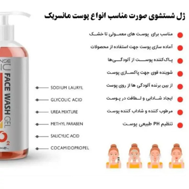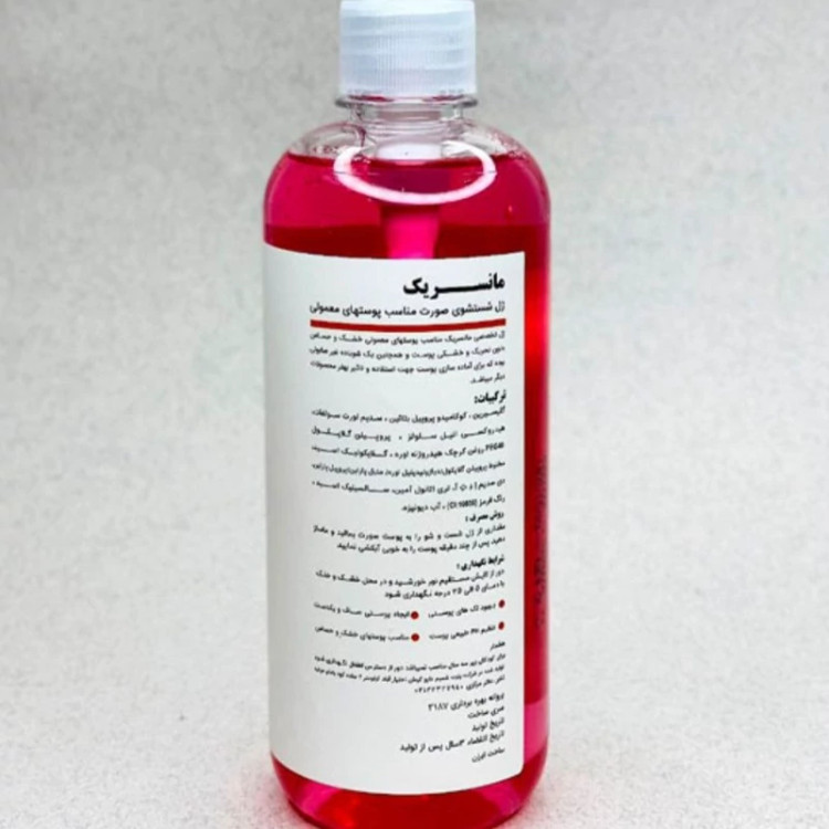 آماده سازی پوست جهت استفاده از محصولات دیگر بهبود لک های پوستی ایجاد پوستی صاف و یکدست پاک کننده پوست از آلودگی ها قدرت پاک کنندگی بالا ایجاد شادابی و لطافت در پوست مرطوب کننده و شاداب کننده پوست تنظیم PH طبیعی پوست حجم 500 میلی لیتر ژل شستشو صورت پوست های معمولی مانسریک تمام آلودگی و سبوم را از منافذ عمیقا پاکسازی کرده، گلیکولیک اسید و سالسیلیک اسید موجود در این محصول با لایه برداری موثر به از بین رفتن لک ها کمک فراوانی می کند و سبب درخشندگی و روشنایی پوست می شود. ژل شستشوی صورت مناسب انواع پوست مانسریک به لایه بیرونی پوست نفوذ کرده و پوست های مرده را ترکیب و از بین ببرد. همچنین، گلیکولیک اسید میتواند ترشح کلاژن و الاستین پوست را تحریک کند و باعث افزایش تجدد سلولی و بهبود بافت پوست شود. این ماده معمولاً برای بهبود بافت پوست، کاهش چین و چروک، تسریع درمان لکههای تیره و ترمیم آکنه استفاده میشود.
